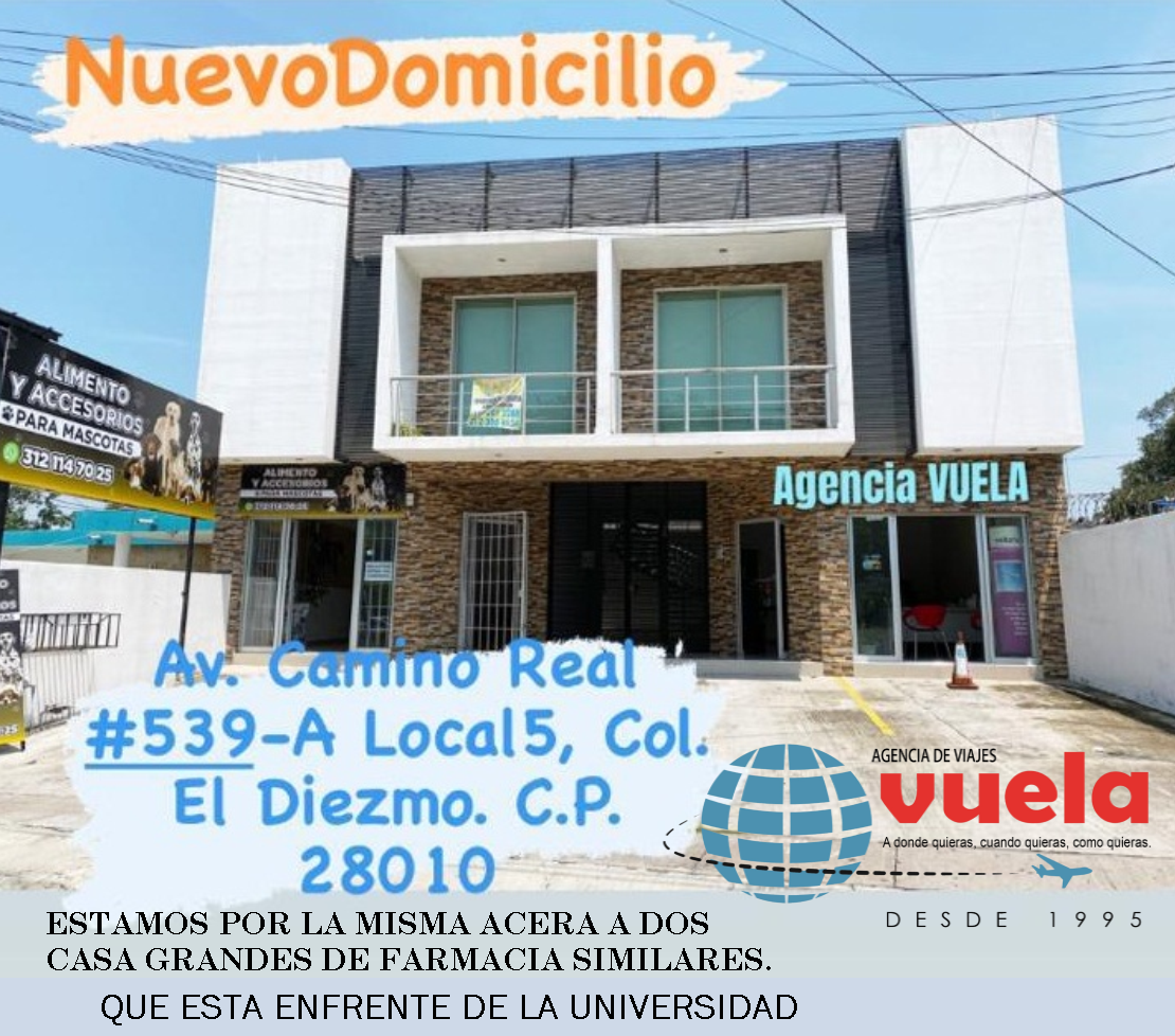 Agencia Vuela, ubicada en Blvrd Camino Real 539 A-Local 5, El Diezmo, Colima, es una agencia de viajes reconocida por su excelente servicio al cliente y atención personalizada. Con una calificación de 4.8 sobre 5 basada en 39 valoraciones, esta agencia se destaca por ofrecer las mejores opciones para vuelos y paquetes turísticos adaptados a las necesidades de cada viajero. Alma, una de sus expertas agentes, es frecuentemente elogiada por su profesionalismo y dedicación para encontrar las mejores ofertas, incluso para clientes que llegan sin cita previa. Agencia Vuela acompaña a sus clientes durante todo el proceso de viaje, desde la planificación hasta la ejecución, garantizando una experiencia sin contratiempos. Ya sea que busques un vuelo sencillo o un viaje completo diseñado a tu medida, esta agencia en Colima es una opción confiable y eficiente. Para más información o para reservar, puedes visitar su página de Facebook o contactarlos al 312 396 5566.