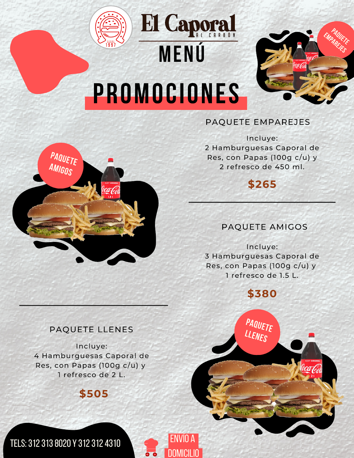 📞 312 313 8020 🌐 https://www.facebook.com/hamburguesaselcaporal