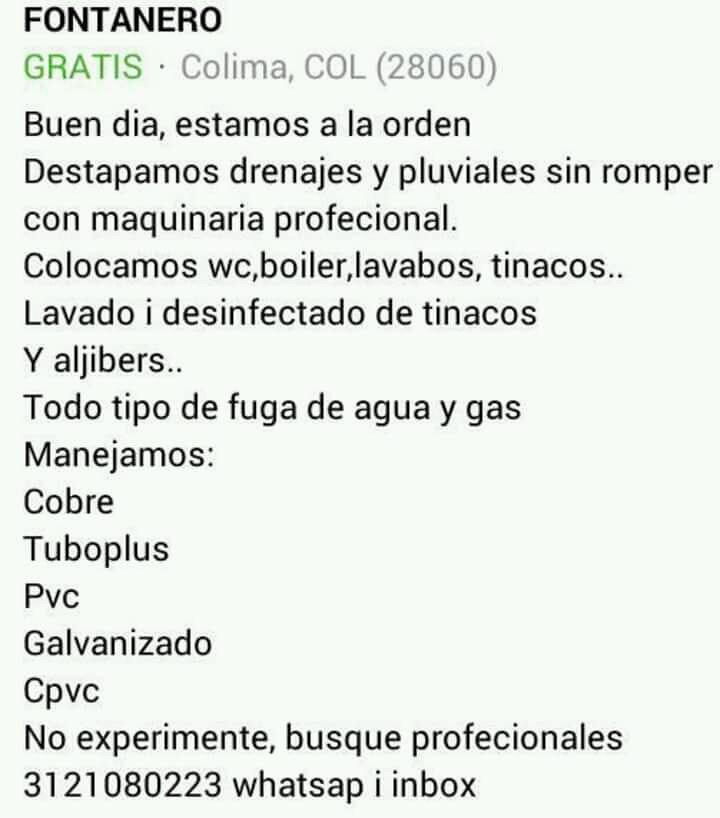 Fontanero Javier Hernandez is a plumbing service located in Colima, specializing in reliable solutions for residential and commercial plumbing needs. Situated at San Antonio 40, Villas Colimán, this local business offers personalized attention and has experience in repairing and maintaining water and drainage systems. Although it holds an average rating of 3 stars based on 10 reviews, customers highlight Javier’s training and professionalism, noting his dedication to completing jobs properly and ensuring client satisfaction. Some reviews mention issues with service and communication. For more information or to request a quote, you can contact them at 312 108 0023 or visit their official website at https://directoriocolima.com. Fontanero Javier Hernandez is an accessible option in Colima for those seeking specialized plumbing services with a focus on quality and commitment.