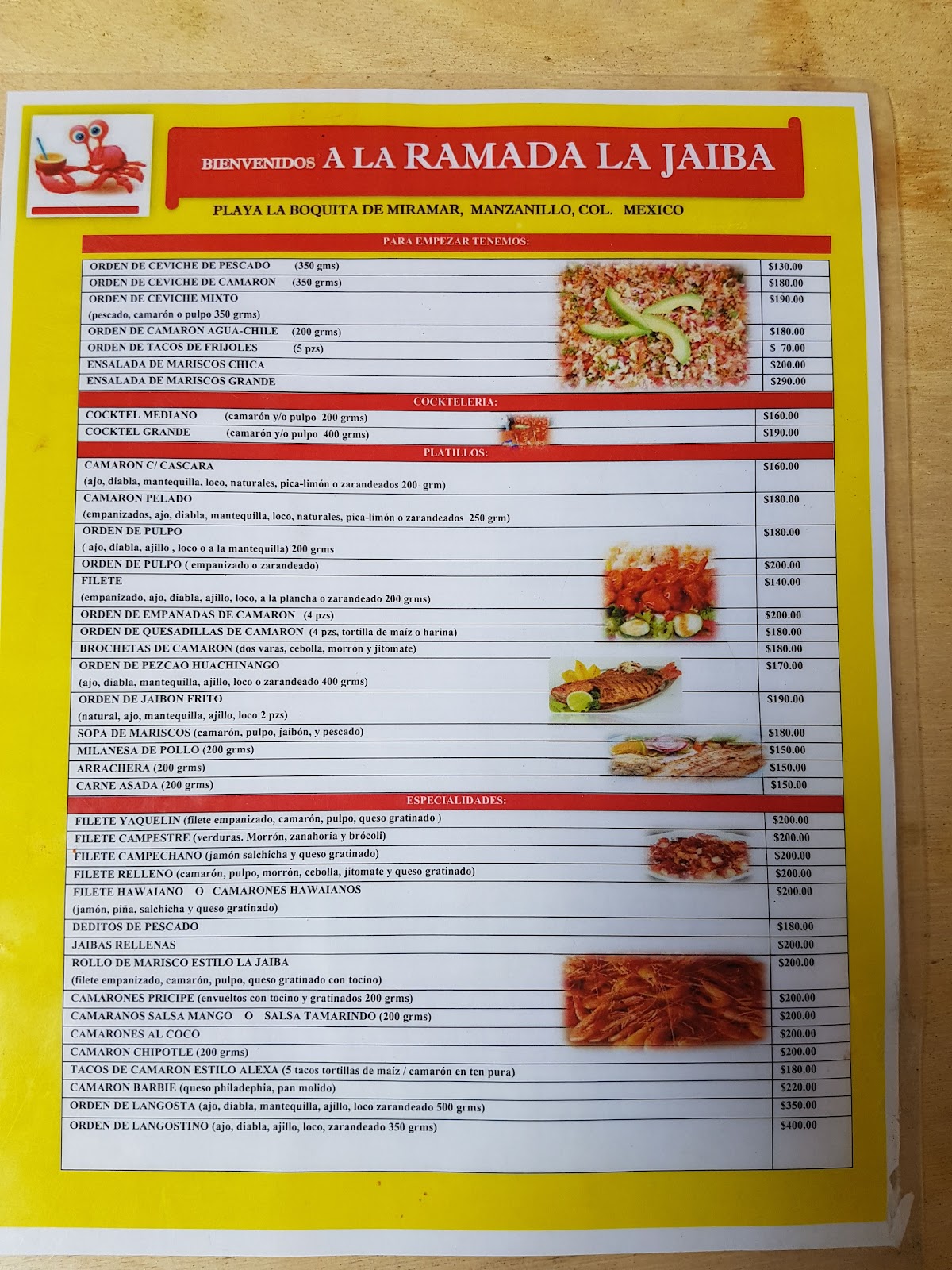 Ramada La Jaiba es un restaurante ubicado en Manzanillo, Colima, específicamente en Calamar 28, Marina Puerto Santiago. Este establecimiento ofrece una experiencia gastronómica que combina mariscos frescos y platillos tradicionales en un ambiente relajado y cercano al mar. Con una calificación de 3.9 sobre 5 basada en 69 opiniones, Ramada La Jaiba es reconocido por su buena calidad en la comida y un servicio atento, destacando la atención personalizada de su personal, como el joven Jesús, quien ha recibido elogios por su dedicación. Además de la oferta culinaria, el lugar también es conocido por actividades recreativas como paseos en motos acuáticas y botes, lo que lo convierte en un punto de interés ideal para quienes buscan combinar buena comida con diversión acuática. Aunque algunos clientes han mencionado que las porciones pueden ser pequeñas y que la presencia de visitantes puede ser un poco molesta, la mayoría valora la experiencia general y la calidad de los platillos. Ramada La Jaiba es una opción recomendable para quienes visitan Manzanillo y desean disfrutar de mariscos frescos en un entorno marino con opciones de entretenimiento.